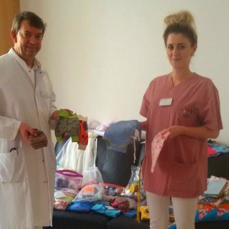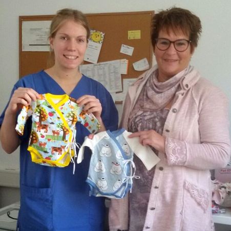 Unsere Sabine betreut das Kreiskrankenhaus in Emmendingen. Vor ihrem ersten Besuch war sie etwas aufgeregt. Völlig unbegründet, wie sich zeigte. Die ontakt-Hebamme Frau Langenbacher und die leitende Hebamme Frau Kaiser waren absolut begeistert. „Ich habe den beiden Hebammen zunächst den Verein vorgestellt und etwas über die tolle Arbeit hier erzählt. Danach durfte ich Ihnen die mitgebrachten Handarbeiten präsentieren. Sie waren sehr beeindruckt von den schönen und mit Liebe erstellten Handarbeiten und Erinnerungsstücken.